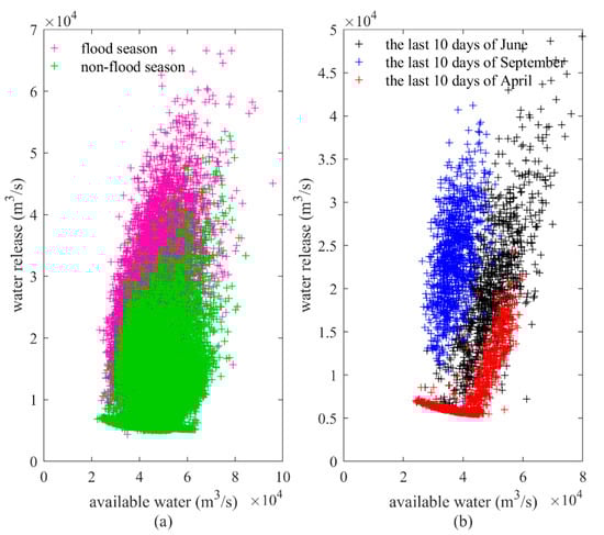 Scatter plots of optimal water release versus available water (). (a) The purple plus signs and green plus signs denote the correlation between optimal water release and available water during flood season and non-flood season, respectively. (b) The black plus signs denote this correlation during the last 10 days of June, the blue plus signs denote this correlation during the last 10 days of September and the red plus signs denote this correlation during the last 10 days of April.