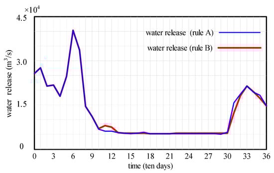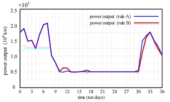 Table 3 shows that the annual power generation of operating rule A is larger than that of operating rule B, while the other indicator is not different. This result is explained as follows. As shown in Figure 11, Figure 12 and Figure 13, in the flood season (from 1-th to 9-th time period), operation results of the two operating rules are the same. However, at the beginning of non-flood season (10-th to 13-th time period), the water release decision of operating rule A is less than that of operating rule B and thus the power output of operating rule A is smaller than that of operating rule B. But rule B will consume the water in the TGR prematurely (in fact, during beginning of non-flood season, the reservoir level is low and such a water release decision is not conducive to power generation) and affect the annual power generation. Finally, at the end of non-flood season (30-th to 36-th time period), the water release decision of rule A is greater than that of rule B, while maintaining a higher water level than that of rule B and so the annual power generation is greater than that of rule B. In short, the decision-making mode of rule A and rule B in flood season is the same but there are differences in non-flood season. At the beginning of the non-flood season, the reservoir water level of TGR is low, rule A keeps a smaller water release decision while rule B keeps a larger water discharge decision. At the end of the non-flood season, the reservoir water level of TGR is high, rule A keeps a greater water release decision while rule B keeps a smaller water discharge decision. Obviously, according to the above discussion, operating rule A is more beneficial to hydroelectric power generation of TGR than operating rule B. That is to say, the most efficient operating rules are identified successfully from given operating rules A and B by SD simulation.