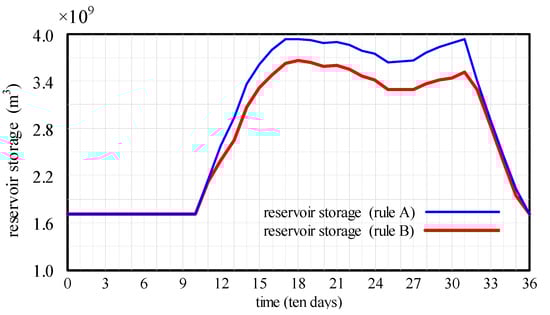 Reservoir storage process of TGR decided by operating rules A and B (the operating horizon is 11 June 2001 to 11 June 2002).