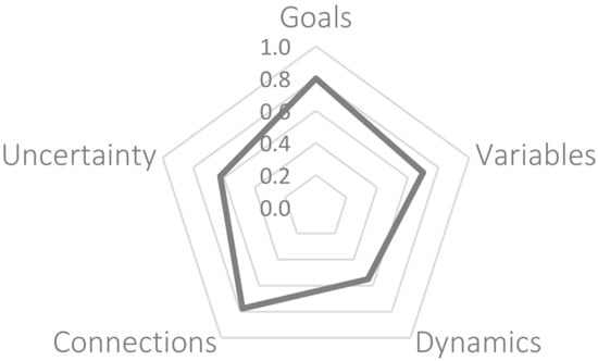 The expert interviews provided interesting insights into the complexity of the problem discussed here. Experts generally described diffuse pollution from agriculture as a complicated to a complex problem, with an averaged complexity degree of 0.69 (on the scale between 0 = simple and 1 = complex). The complexity of the problem varied along the five dimensions, with the dimensions of goals being particularly complex (0.8), followed by the dimensions of interconnections (0.78), variables (0.70), uncertainty (0.63), and dynamics (0.55) (Figure 1).