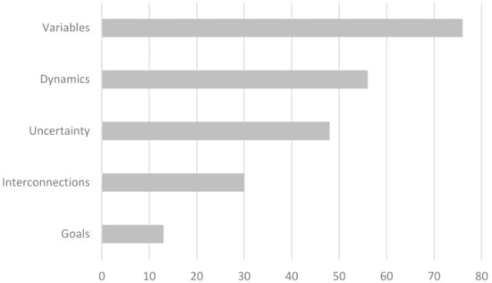 Further, interviews provided qualitative arguments to substantiate the numerical evaluations of complexity. Text segments mostly related to different variables; this was followed by the dynamics, uncertainties, and interconnections related to the variables; and these were finally followed by the different types of goals (Figure 2). Table S4 presents the main qualitative arguments.