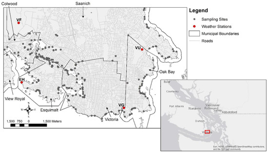 The Capital Regional District (CRD) of southern Vancouver Island is a government body representing 13 municipalities and three electoral areas. The core area of CRD has approximately 270,000 people and 27,600 hectares including residential, industrial, commercial, institutional and agriculture regions. The area has approximately 8350 properties with onsite sewage disposal and with others connected to a sewer system [2]. The CRD assists these municipalities in developing their stormwater management plans and infrastructure, as well as water quality monitoring for these municipalities. Coastal water quality has been a critical issue worldwide for nearshore inhabited regions and the CRD is no exception. Coastal water quality is known to be affected by natural and human factors includes runoff, sewage wastewater, land reclamation and climate change [41]. The implementation of monitoring programs is necessary and critical in managing coastal water contamination [42,43]. The CRD collects pollutant levels (including fecal coliforms) within stormwater pipes, streams and nearshore areas throughout the CRD, with an interest in identifying hotspots and remediating those areas of highest priority. This process includes collecting water samples and analyzing for fecal coliform bacteria in the sample. The collected data are used to estimate and analyze the distribution of microbial contamination and any possible public health concerns. This allows the jurisdictions involved to undertake remedial measures where most needed. Currently, the sampling frequency is regulated primarily by cost and capacity but increased sampling strategies are advised for locations exceeding a certain threshold. Given that fecal coliform contamination in stormwater runoff is directly influenced by climate and watershed properties [10,13,44], a regular sampling scheme that does not consider climate and weather will likely miss peaks in contamination.