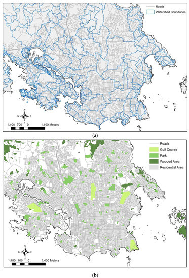 The study area is located on the southeastern core area of the CRD between latitudes 48°29′57.3″ N and 48°24′02.2″ N, and longitudes 123°26′26.3″ W and 123°15′40.4″ W. Shown in Figure 1, the study area forms part of the “core area” of the CRD and is approximately 15,000 hectares in size and spanning six municipalities, two First Nations, federal, provincial, regional, and municipal parkland. Land use in the core includes residential, commercial, industrial, institutional, and agricultural activities and is shown in Figure 2b. The region lies within the Coast Mountains and Islands physiographic region, and contains a number of watersheds of variable size, some natural and some urbanized, draining to the coastline through stormwater drainage systems or creeks and rivers. Within the Georgia Depression Ecozone, the Biogeoclimatic zone is Coastal Douglas Fir, which experiences mean annual temperatures of almost 10 °C and mean annual precipitation of over 1000 mm annually [48]. The mean coldest month is January with average temperatures of around 3 °C and the mean warmest month is in July, which averages roughly 17 °C. This mild climate experiences on average 204 frost-free days per year. While weather systems in British Columbia are highly impacted by elevation changes, the elevation change in the study region is less than 50 m. Rainfall systems for this area tend to form in the north Pacific and move easterly across the mountain range running down the center of the island. The process leads to greater rainfall on the western side of the Island and less on the leeward side (eastern side) resulting in a rain shadow for the study area because it is on the eastern side of the Island [48]. Rainfall is higher in the winter months and leads to stormwater runoff draining through the natural portions of the watershed (see Figure 2a) or through the stormwater minor drainage system and pipe system to end up discharged to the coastal harbors shown in Figure 1. Soils in the overburden above rock formations in pervious areas are generally Distric Brunisol [48] soil type within the Luvisolic soils group, which are typically well draining.
