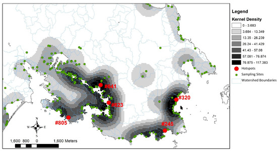 ArcGIS was used to visually explore the logarithm of the geometric mean of fecal coliform data above the regulated threshold of 200 CFU/100 mL collected within and adjacent to nearshore areas in the study region. The spatial distribution of bacterial contamination is visualized using the Kernel Density [50] which calculates the density of points in a region for each cell multiplied by the unit area. This map can provide a visual summary of the spatial distribution of fecal coliform data across the region as well as suggest any “hot spots”. Figure 4 shows the areas determined as hot spots with high fecal coliform levels. The areas with deeper shading, indicating higher levels of FC are seen near the Victoria downtown, Esquimalt and the eastern shore area of Oak Bay. The southern shore of Oak Bay and the northeastern shores of Victoria have relatively lower pollution levels. The density map was also used to select hot-spot stations for further analysis (also shown in Figure 4). The five stations shown were selected to span the visually obvious areas of high FC levels, but also were stations that had consistent data collection over the period. The hot spots are located in the densely populated residential areas, which suggest that the source of fecal coliform is likely from urban activities. These five stations are further studied in the temporal analysis section.