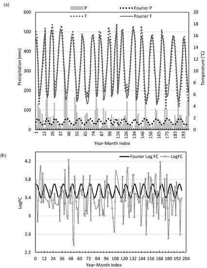Figure 5a,b show the time series of LogFCy,m and the average precipitation and average temperature in the corresponding month, along with the best fitted series for each variable. Figure 6 shows three panels with the average monthly data (LogFCm is shown in Figure 6c) over all 17 years. Fourier series models describing the fitted curves are also shown. Table 1 shows the Fourier coefficients and the RMSE and R2 values for the best fit models. Higher order harmonics were attempted until R2 values ceased to increase. For Py,m and LogFCy,m, a simple, one harmonic best fits the data although the RMSE is high. For temperature, Ty,m, an 8 harmonic Fourier model fit the temperature function for this area over the 17 year period extremely well. The lower harmonics did not produce nearly as good an R2 value.