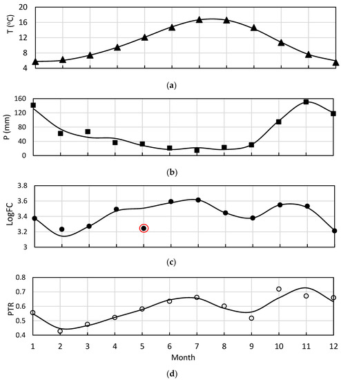 Similar profiles are seen in Figure 6a,b for mean monthly temperature and precipitation over the entire 17 year period. Models 4 and 5 show fundamental frequencies of roughly 0.6, corresponding to a roughly annual periodicity that is clearly shown in the two panels. Models 6 and 7, for LogFCm, and PTR, respectively, also show periodic signals of roughly 12 months; however, the signal peaks do not mimic either of those made by precipitation or temperature. Figure 6c shows two peaks—one in July and one in October. While both the PTR and LogFCm curves show a nearly identical curve in the fitted Fourier models, there is a glaring discrepancy in the month of May (shown circled in red in Figure 6c). Recall that the sampling program is focused on two seasons: January to April and June to September. May is not usually sampled. The PTR curve seems to suggest that the data point shown in May is an outlier requiring further consideration in the data. The models also suggest that more than just precipitation or just temperature are responsible for the oscillations seen in the curves.