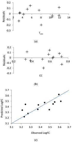 The goal of this section is to develop a general function for predicting the LogFC with selected meteorological variables. The significant but low correlations suggest that attempting to linearly regress all of LogFCi,j with one or more climate variables may likely show a significant relationship but the R2 would likely be poor. Figure 7a, Figure 7b and Figure 7c show the data as a function of mean temperature for all LogFCi,j, LogFCy,m and LogFCm, respectively. These scatterplots indicate the variance in the data that a linear regression model must attempt to explain. Thus, LR was only attempted on LogFCm.