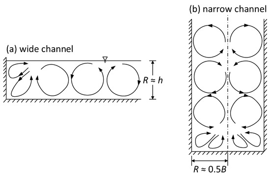 In open channel flows, the hydraulic radius is traditionally defined as the ratio of the area of a cross-section to its wetted perimeter. It can be used for computing the average boundary shear stress at a cross-section under uniform flow conditions. On the other hand, the hydraulic radius also provides a reasonable measurement of the dimension of the large-scale flow structures. As sketched in Figure 2, it can be approximated as the flow depth for a wide channel and one half of the channel width for a narrow channel [25]. Mathematically, the hydraulic radius is expressed as: