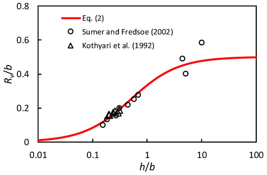where may be referred to as the pier hydraulic radius. It is noted that , as a combination of and , provides a length scale that describes the typical size of the horseshoe vortex. In the following, Equation (2) is compared with laboratory measurements available in the literature.