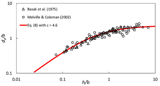 Figure 5 presents a comparison of Equation (8) with the two series of data, one being summarized by Melville and Coleman [6] for circular piers and the other reported by Basak et al. [29] for square piers. It can be seen that Equation (8), with , depicts the trendline of the data used.