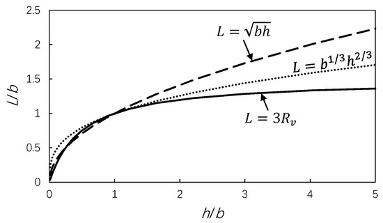 The pier hydraulic radius proposed in this study provides a useful length scale for the scour depth. It is noted that several other length scales have been employed in the previous studies to normalize the scour depth at a pier. Examples are the commonly used pier width and a combination of and , such as [30], [9], and [7]. Figure 6 compares the three different length scales (), , , and , by plotting against . To facilitate the comparison, is multiplied by three so that the three curves meet at From Figure 6, it can be seen that: (1) in the region of ≈ 1, the three length scales are close to each other; (2) for < 1, is close to ; and (3) for large , approaches the limit of 0.5 (which is similar to the variation in the scour depth for large ), but both and approach infinity, which is not practically acceptable.
