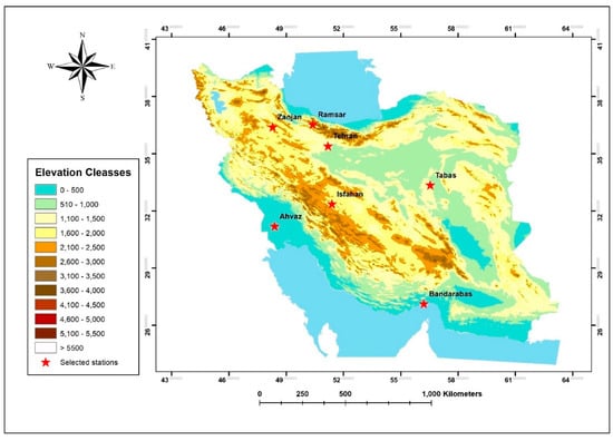 A map of Iran illustrating the geographical topography and the selected locations, where the model simulations were made for dew formation potential.