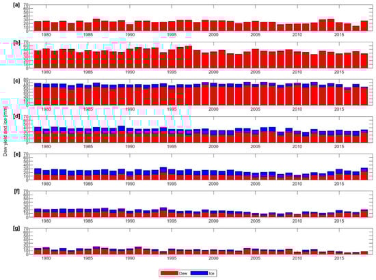 Yearly cumulative dew yield in water and ice forms during 1979–2018 at the selected stations: (a) Ahvaz; (b) Bandarabas; (c) Ramsar; (d) Zanjan; (e) Isfahan; (f) Tehran; and (g) Tabas.