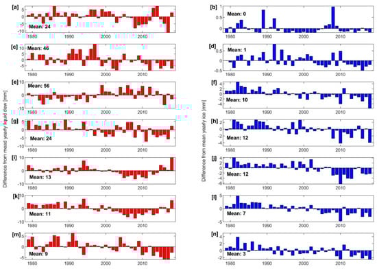 Difference between mean yearly cumulative dew yield in water form (left panel) and ice form (right panel) and yearly long-term mean during 1979–2018 at the selected stations: (a,b) Ahvaz; (c,d) Bandarabas; (e,f) Ramsar; (g,h) Zanjan; (i,j) Isfahan; (k,l) Tehran; and (m,n) Tabas.