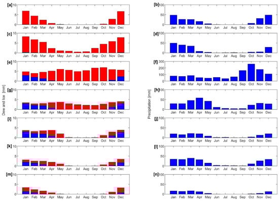 Mean monthly cumulative dew yield in water form (red) and ice form (blue) shown in the left panel and compared to the precipitation (right panel) at the selected stations during 1979–2018: (a,b) Ahvaz; (c,d) Bandarabas; (e,f) Ramsar; (g,h) Zanjan; (i,j) Isfahan; (k,l) Tehran; and (m,n) Tabas.