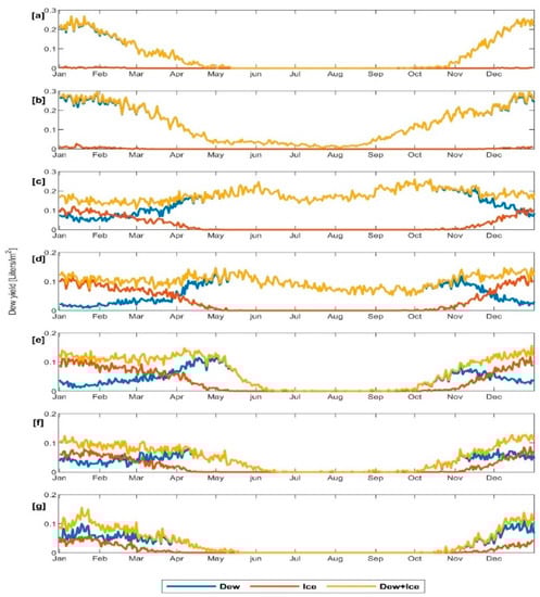 Mean daily cumulative dew yield (blue line), ice (red line) and dew+ice (yellow line) during 1979–2018 at the selected stations: (a) Ahvaz; (b) Bandarabas; (c) Ramsar; (d) Zanjan; (e) Isfahan; (f) Tehran; and (g) Tabas.