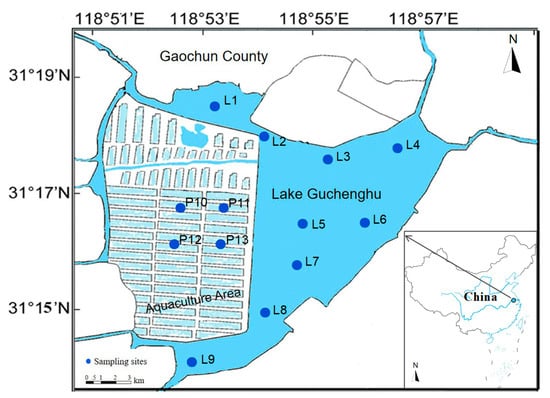 The Lake Guchenghu (Latitude: 31°14′–31°18′ N, Longitude: 118°53′–118°57′ E, Area: 3300 hm2; Figure 1) located in Nanjing City (Jiangsu Province, China) is a crucial water source for the commercial aquaculture of mitten crab, and provides drinking water to part of the local residents. The lake is in the subtropical monsoonal climate zone and the annual average precipitation is 1105.1 mm, of which the summer rainfall is 428.6 mm (i.e., about 40% of the annual precipitation). Mitten crab ponds are located in the reclamation area around the Lake Guchenghu, pumping water from the lake in spring and discharging wastewater back into the lake in autumn. Due to the reclamation, the lake area is only 39 km2, while the storage volume is 65 million m3.