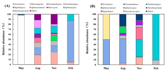 Seasonal variation of cyanobacteria community in Lake Guchenghu and adjacent mitten crab ponds from May 2017 to February 2018 (A): Lake; (B): Ponds.