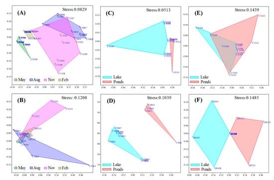 Non-metric multidimensional scaling (NMDS) ordination of cyanobacteria community in Lake Guchenghu and adjacent mitten crab ponds among different months. ((A): Lake; (B): Ponds; (C): May 2017; (D): August 2017; (E): November 2017; (F): February 2018. The first four digits of the number represent the sampling time, and the last two digits represent the sampling point.).