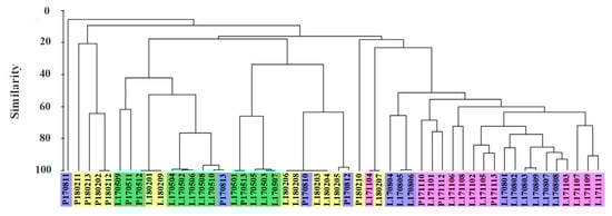 Similarity analysis for cyanobacteria community in Lake Guchenghu and adjacent mitten crab ponds among different months by cluster analysis. (Green for May; Blue for August; Pink for November; and Yellow for February.) (“L” represents Lake; “P” represents Ponds; the first four digits of the number represent the sampling time, and the last two digits represent the sampling point.).