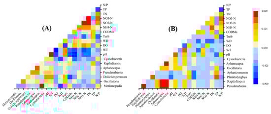 The results of Pearson correlation between predominant cyanobacteria species and environmental parameters in Lake Guchenghu and adjacent mitten crab ponds ((A): lake; (B): ponds).