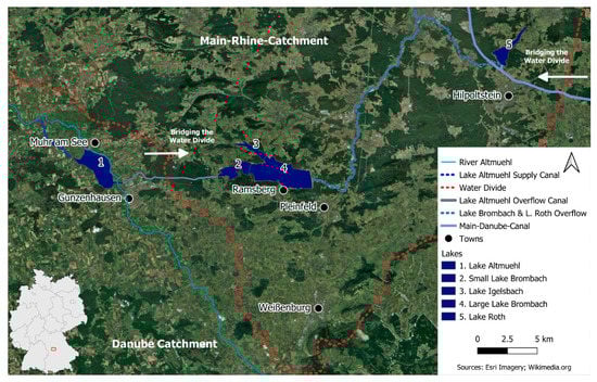 As the boom of dam construction in Germany has already exceeded its peak, it is necessary to look at established reservoirs and their implications. The FLD, planned in the 1970s and opened in the year 2000, is one of Germany’s largest water management projects. The systems primary function is to bring water from the Altmuehl and Danube catchment bridging the European watershed into the comparably drier Main (-Rhine)-Catchment [,]. It consists of several artificial lakes and canals, the centre being the Large Lake Brombach with its upstream dams Lake Igelsbach and Small Lake Brombach as well as Lake Altmuehl and Lake Roth (see Figure 1). Each year, around 25 Mill. cubic meters of water are retained in Lake Altmuehl and cross the watershed through a water conveyance tunnel into Lake Brombach []. Apart from maintaining consistent water supply and quality downstream, the system also offers flood protection upstream, hydro energy production as well as recreational areas []. Because of an increase in extreme weather conditions due to climate change like droughts, the importance of this water transfer is likely to rise in the future.