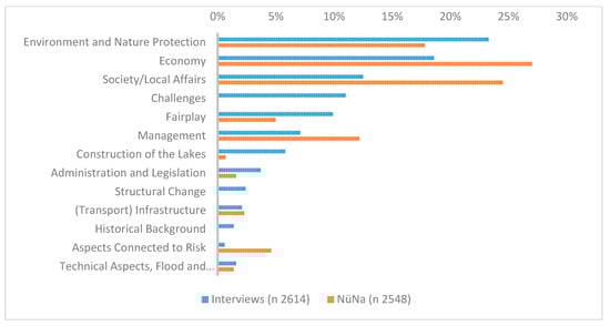 The amount of coded segments in both data sources shows that certain aspects are subjects of a lively discussion, while others are not as prominent in the perception of the stakeholders and the coverage of the NüNa. The dominating discourses arise in environmental, economic, societal/local affairs, management and challenges/fair play categories, making up 82.4% of coded segments in interview data and 86.5% in NüNa articles overall. The environmental issues include topics like changes in the landscape, protected areas but predominantly natural phenomena mainly cyanobacteria and geese, both being directly connected to the FLD. The category Economy contains aspects connected to local value creation. Most importantly it includes Tourism as one of the most significant sectors in the study area with a multitude of connections to different features and factors. Local affairs summarises aspects that are of interest for local residents and is therefore well represented in the media as are management related aspects. The latter informs the public through the NüNa about water transfer matters, water quality matters and water level fluctuations in a descending order. The higher share of mentioned Aspects connected to Risk in comparison to the interview data could be explained by considering the media purpose of informing the public. Due to the different data source characteristics regarding function and purpose, challenges and fair play aspects are a category dominated by interview data, because they provide a more in-depth understanding of underlying situations and processes provided directly by stakeholders. As the analysis of frequencies in coded segments is a suitable way to get an overview of topics and discourses present at the lakes, further understanding can be created by analysing overlaps of categories and codes.