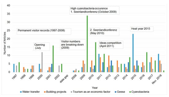 With 237,414 copies sold in the fourth quarter of 2018, the daily newspaper “Nürnberger Nachrichten“ (NüNa) is the highest-circulation newspaper in the study area []. The decision for the investigation periods of the NüNa from 1 January 1990 to 31 November 2002 and from 1 January 2008 to 30 November 2018 was taken considering important events in the FLD. These include the phase of construction, the opening as well as currently relevant issues (increasing emergence of cyanobacteria, the heat and drought years 2011, 2015, and 2018, Seenlandkonferenzen (lake district conferences) with involved stakeholders 2009 and 2010). This list of events of interest was derived from information of literature studies and the semi-structured expert interviews.
