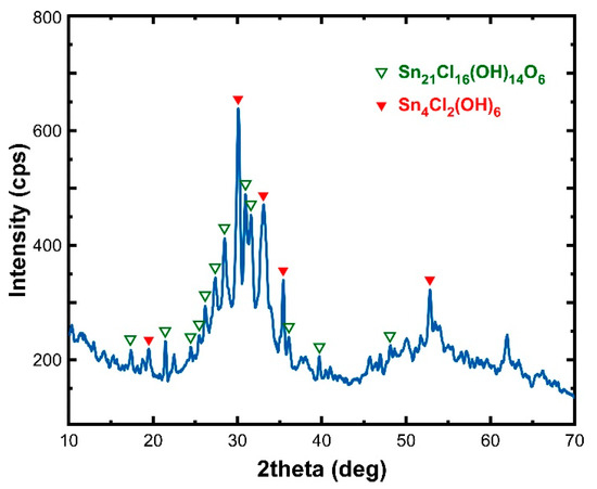 Structural analysis by XRD indicated that the high excess of Cl− in the reacting mixture enabled the more favorable production of chloro-oxy-hydroxides (Figure 2). In particular, the multiple peaks observed were identified by variations in composition and crystallinity of the Sn2+ oxy-hydroxide with the formula Sn21Cl16(OH)14O6, which corresponds to the mineral phase of abhurite (PDF #39-0314). The presence of Sn4Cl2(OH)6 (PDF #15-0675) and an amorphous background were also determined.