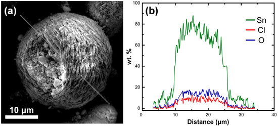 The morphological characteristics of the precipitated solid resembled those of the bladed structure of abhurite forming a skein-like structure in spherical units with a diameter of around 40 μm (Figure 3a). The spheres normally feature a pit in the one side indicative of their radial growth process. Analysis by energy-dispersive X-ray spectroscopy verifies both the composition homogeneity and the high Cl content of the material. Line scanning element quantification through a sphere suggests an Sn percentage around 75 wt %, whereas Cl fluctuates around 10 wt %. and O around 15 wt %. (Figure 3b). Such proportions were very similar to those expected for abhurite stoichiometry as well as to the chemical analysis of Sn by atomic absorption spectroscopy and Cl by ion chromatography. In addition, the percentage of tin appearing in the Sn2+ oxidation state was measured to be 86% of total tin, which indicates a very high reducing potential of the synthesized material.