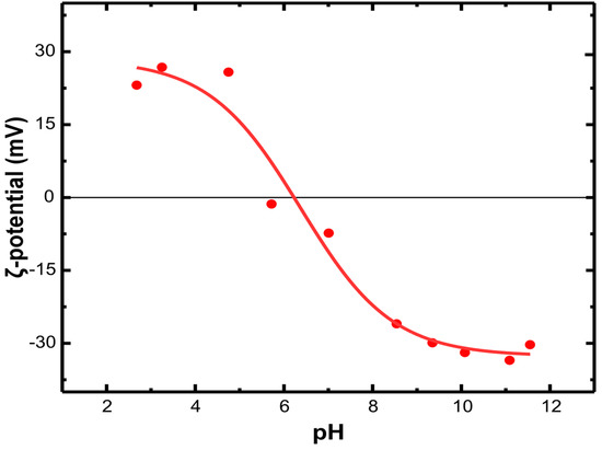 Surface properties are a critical feature of the developed material when reviewing adsorbents for water treatment. Here, the specific surface area was found to be 21 m2/g due to the relatively high crystallinity favored by the synthesis conditions. Furthermore, electrophoretic mobility measurements indicate a pH value of 6.1 as the isoelectric point, thus implying a negative surface charging within the normal range of natural water pH (Figure 5).