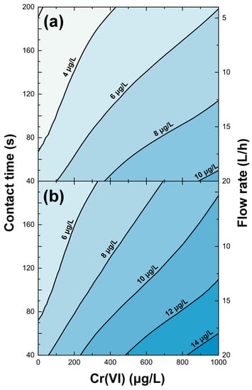 Contour plot of residual Cr(VI) versus contact time and initial Cr(VI) concentration in the tested filtering system at pH 7 (a) and pH 8 (b). Error in Cr(VI) determination was ±2%.