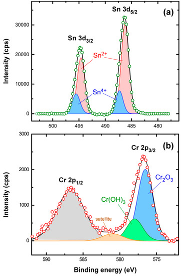 The reducing potential of the adsorbent as defined by the stabilization of Sn2+ in its structure was assumed to be the key for the capture of dissolved Cr(VI). In agreement with titration determination of tin oxidation states, Figure 8a verifies the domination of the bivalent state specifically on the adsorbent’s surface even after its use for Cr(VI) removal. Fitting of obtained Sn 3d peaks signified two main contributions at 486.2 eV and 494.6 eV attributed to Sn2+ compounds and two smaller contributions at 487.2 and 495.5 eV originating from Sn4+ compounds formed on the surface after Cr(VI) reduction or reaction with dissolved oxygen. Quantification of the results suggests that the Sn2+/Sn4+ ratio in the few-nanometers depth of XPS measurement was around 4:1.