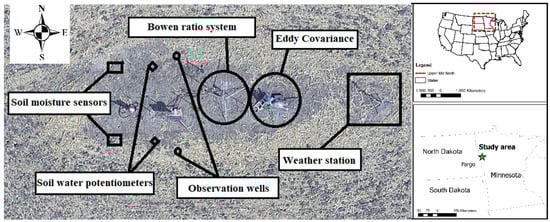The study site is located in the Buffalo-Red River watershed in Clay County, west central Minnesota (46°59′20″ N, 96°41′06″ W) at an altitude of 271 m above sea level (Figure 1). The climate of the region is sub-humid, with a cold winter and a mild and humid summer. The location receives a mean annual precipitation between 533 and 635 mm, with 428 mm rainfall during the growing season in 2018.