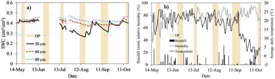 Figure 2. (a) Average daily soil water content (SWC) and (b) average daily temperature, relative humidity, and rainfall amount during the 2018 growing season. Tan colored zones show the observation periods (OPs).