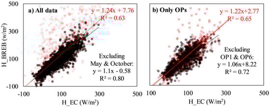 Figure 3. Comparison of measured sensible heat flux (H) using the eddy covariance (EC) and Bowen ratio-energy balance (BREB) methods for the entire growing season (a) and the OPs (b). The right corner of the plots shows the fitting equations when excluding data in May and October for all data in (a), and OP1 and OP6 for Ops in (b).