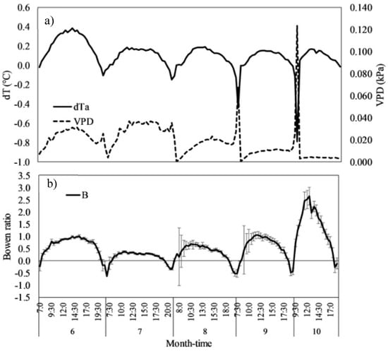 Figure 4. (a) Diurnal fluctuation of air temperature (dTa) and vapor pressure deficit (VPD) and (b) measured monthly average Bowen ratio (β) and calculated error for β on a diurnal basis.