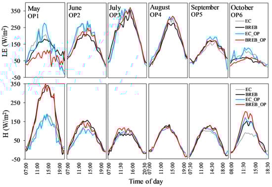 Figure 5. Average diurnal latent heat (LE) and sensible heat (H) flux using the EC and BREB systems for each month of the growing season and the OPs.