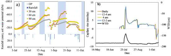 Figure 6. (a) Daily average soil water potential at three depths during the OPs and (b) daily average water table depth (WTD) and calculated capillary rise from a shallow water table.
