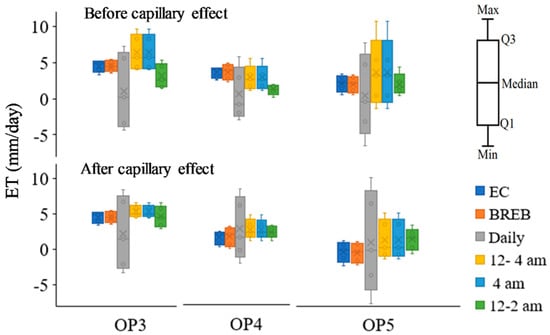 Figure 7 shows the boxplot comparison of ET determined at the different times with the SWB method with ET determined by the BREB and the EC method in OP3, OP4, and OP5. As shown in Figure 7, using the daily average soil moisture data to calculate the soil water exchange gave the worst ET result. Among the different approaches, using the average 24:00–2:00 soil water content for the daily ET calculation provided the best result in comparison with the ET values determined by the BREB and the EC methods and, statistically, showed no significant differences at a 95% confidence level.