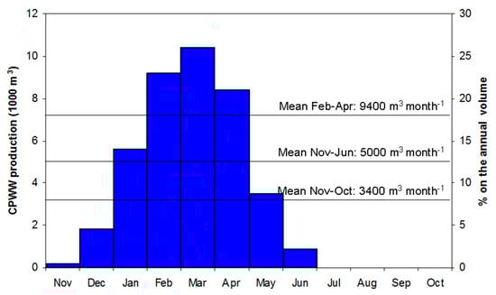 The amount of citrus processed is characterized by a noticeable interannual and intra-annual variability. The interannual variability of citrus processing is linked to the variations of the fruit production from one year to another, since the citrus amount processed each year depends on both agricultural production and market trends. The intra-annual variability mainly depends on plant operation. Since over 70% of citrus production destined to transformation is concentrated between February and April [25], in the Mediterranean areas citrus processing plants mainly operate in this period. The monthly variability depends, beside the amount of processed citrus, on the variability of water unit consumption, which, in turn, is significantly affected by residual factors (citrus-fruit quality, plant management, etc.). Figure 2 shows a typical monthly distribution of wastewater production in a citrus-processing company with a potentiality of 40,000 tons yr−1 of processed citrus [14].