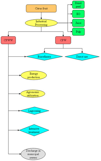 In order to fill this gap and update the current knowledge about CPWW management systems, this paper reports an overview of the possible alternatives and management/valorization solutions available for CPWW. In more detail, first, a concise analysis of citrus-processing technologies, on which the quantitative and qualitative characteristics and variability of CPWW depend, is carried out. Then, the traditional and the most recent treatment/valorization options, as proposed in the scientific literature, are discussed. Finally, the most innovative techniques for the recovery of value-added compounds from CPWW are presented. A comparison among the different processing schemes is given in the conclusive considerations. Starting from this, state-of-art insights about the most suitable solutions for the economic and environmental sustainability of CPWW management chain are provided to company managers and other stakeholders.