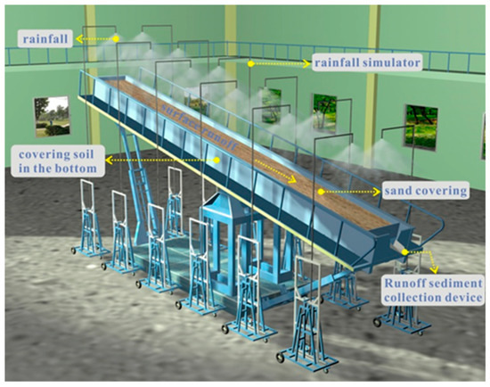 The artificial simulated rainfall device made up of an X-shaped sprinkler, which was proved by raindrop spectrum and the end of velocity [52]. The test rain intensity was 1.5 mm/min, with a minimum rainfall uniformity of 85%, and an effective rainfall height of the side spray type rainer for rainfall of 4 m. Intermittent rainfall events were simulated; three continuous rainfall events were simulated for the same underlayer pattern, with the rainfall event interval of 24 h. All experiments were recorded from runoff generation time, and the runoff duration was defined as 30 min. However, the sand of the 1.5 cm sand slope eroded to the bottom of the test tank after the second rainfall, so no third rain was performed. The soil trough used in the test was 13 m long, 1 m wide, and 0.7 m high, with a slope of 12° (Figure 1).