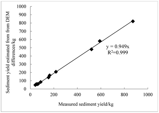 Before and after each rainfall, a 3D laser scanner (Trimble FX, Westminster, CO, USA) was used to scan the point cloud data of the slope. The accuracy of the instrument was 2 mm in the range of 20 m. The point cloud data was de-noised, spliced, calibrated, and processed by Trimble Real Works, and the same digital coordinate system was used to generate a slope digital elevation model (DEM) with a resolution of 5 × 5 mm by ArcGIS 10.1. First, we obtained the elevation difference (the unit is m) between before and after rainfall spatial point erosion on the slope. Then, the erosion volume was calculated via the elevation difference multiplying the grid area. Finally, the amount of erosion was measured by soil bulk density multiplying the erosion volume. The prediction error was obtained via comparing the DEM-estimated erosion and the corresponding measured values; the prediction error range was 0.35–14.84%. Regression verification was carried out on the erosion amount calculated by the DEM and the measured sediment yield (Figure 2, R2 = 0.999). The experimental steel trough was divided into 1 × 1 m slope sections, with a total of 13 sections, from the runoff outlet upward, which were followed by 1–13 m slope sections, and the erosion amount of each section was calculated according to DEM.