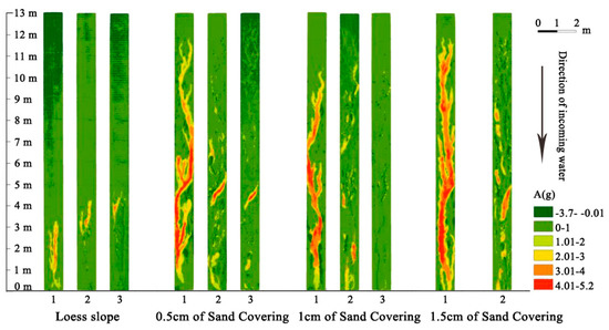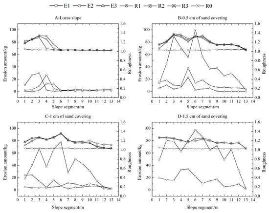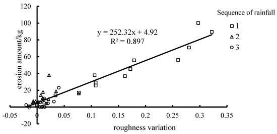 Loess soil has a good structure and viscosity. Slope erosion in the process of rainfall follows the rules of erosion–sheet erosion–fine groove erosion in which the raindrops splash the soil particles from the soil and the runoff formed on the slope transports the separated sediment particles. At the beginning of the rainfall, the dry soil is easily detached and transported. Deposition occurred on the top of slope. On the one hand, sediment was easy to deposit during transport processes because of the lower runoff energy on the top of slope. One the other hand, the soil become tampered as rainfall continues and soil erodibility is weakened. It is not enough runoff energy to detach the soil particle on the top of slope. The surface particles of the coated loess are poorly viscous and the pores are large, and the rainwater forms a sand interface flow in the sand layer [41]. The slope of the sand-covered slope generally follows the rules of vertical infiltration–subsurface, flow–seepage, and erosion–collapse. For this reason, the shape of the sand-covered slope is variable, and collapses and mud can occur at any time. However, the initial correlation between the amplitude and erosion of the sand slope microtopography attenuates with subsequent rainfall events. Taking the whole rainfall series covering the 0.5 cm slope (Figure 6) as an example, it can be seen that there was a linear relationship between the amount of erosion and the amplitude of microtopography. This difference is mainly due to the maximum amplitude and erosion of the microtopography during the first rainfall, which controls the distribution pattern of the overall data.
