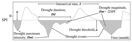By applying the run theory [] to the SPI series at a given timescale, the following characteristics of the droughts can be determined (Figure 1): drought duration (), during which the SPI is continuously below an adopted critical level or threshold (u); magnitude () indicating the cumulative absolute deficit due to a drought event below the threshold; drought maximum intensity () indicating the minimum value of the drought index below the critical level, and interarrival time (L), which is the time range between the initiation of two consequent drought events.