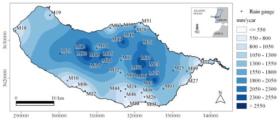 Due to the strong topography influence, the rainfall falls predominantly in the north facing slope because of the prevailing N-E trade winds []. The rainfall regime, which is remarkably variable between the northern and southern slopes, is not only affected by the local circulation, but also by synoptic systems which are typical in mid-latitudes, such as fronts and extratropical cyclones, and the Azores Anticyclone in the summer season []. Rainfall in Madeira is concentrated in the period from October to mid-April, while in summer (from June to August) the rainfalls are very low []. The average annual rainfall in Madeira presents a very uneven distribution—Figure 2 and Table 1. The highest average annual values, exceeding 2200.0 mm, are observed in the northern slope and especially in the central highland region of the island (e.g., the rain gauges of M01 with 2592.2 mm, and M02 in the Paúl da Serra region with 2605.7 mm), which is the critical one for the island’s water security because it is where most of the natural groundwater recharge areas are located [,]. The smallest rainfalls, less than 650.0 mm, occur in the lowland areas of the southern slope (e.g., the rain gauge of M05 in the city of Funchal with only 608.4 mm).