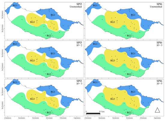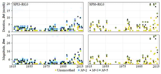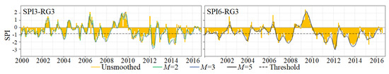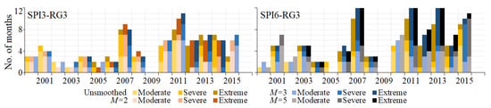 To support the choice of the values of the running lengths, the yearly number of months under moderate or worse drought conditions (Table 2) given by SPI3-RG3 and SPI6-RG3, for the last 16 years with data, were obtained as a function of M, as shown in Figure 6. According to the figure, the regionalized unsmoothed SPI3 indicates 65 months with , whereas for , and , there are 68, and 72 months, respectively. The equivalent numbers for SPI6 are 77, 88, and 94 for the unsmoothed and for the smoothed series with , , respectively. The number of months with moderate or worse droughts from the unsmoothed and smoothed SPI3 series is similar. For the SPI6 series it increases, especially due to the increase in the number of months with severe and extreme droughts (e.g., the year of 2011 or 2015).