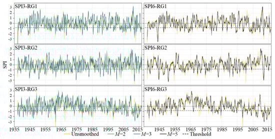 For the central region, RG3, Figure 5 presents the temporal evolution for the period from 2000 to 2016, adopted as example, of the regionalized SPI (SPI-RG3) from the factor analysis based on the unsmoothed and smoothed series with different running lengths. The figure shows that the application of MA to the original SPI series prior to the factor analysis, eliminates spurious and short duration events for both regionalized SPI3 and SPI6, and that the value of the running length determines the smoothness of the factor score time series. Although the SPI series with M of 2, 3, and 5, are smoother than those computed based on the unsmoothed data, the general pattern for the different time series is the same.