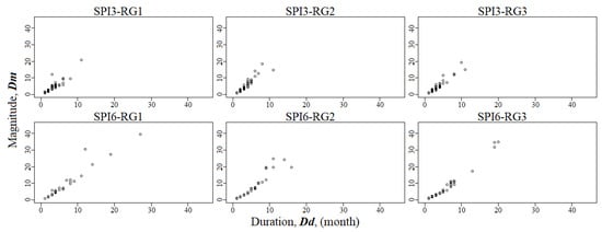 The understanding of the relationship among drought duration and magnitude is essential to better comprehend the phenomenon and its impacts. For this purpose, the and values were obtained for the 80-year period by applying the run theory (Section 3.1) to the smoothed SPI3 and SPI6 series ( and , respectively), as shown in Figure 8. The resulting descriptive statistics are presented in Table 6.
